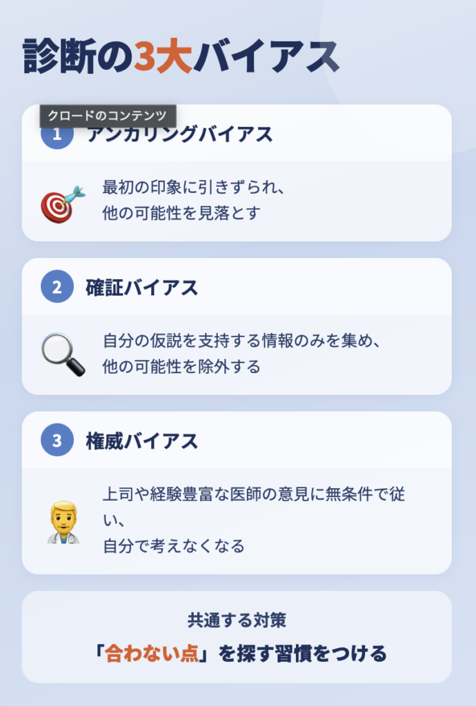 臨床の現場では、知識や技術と同じくらい「思考のクセ」が診断の精度を左右する。今回は研修医が特に陥りやすい3つのバイアスと、その対策を整理する。